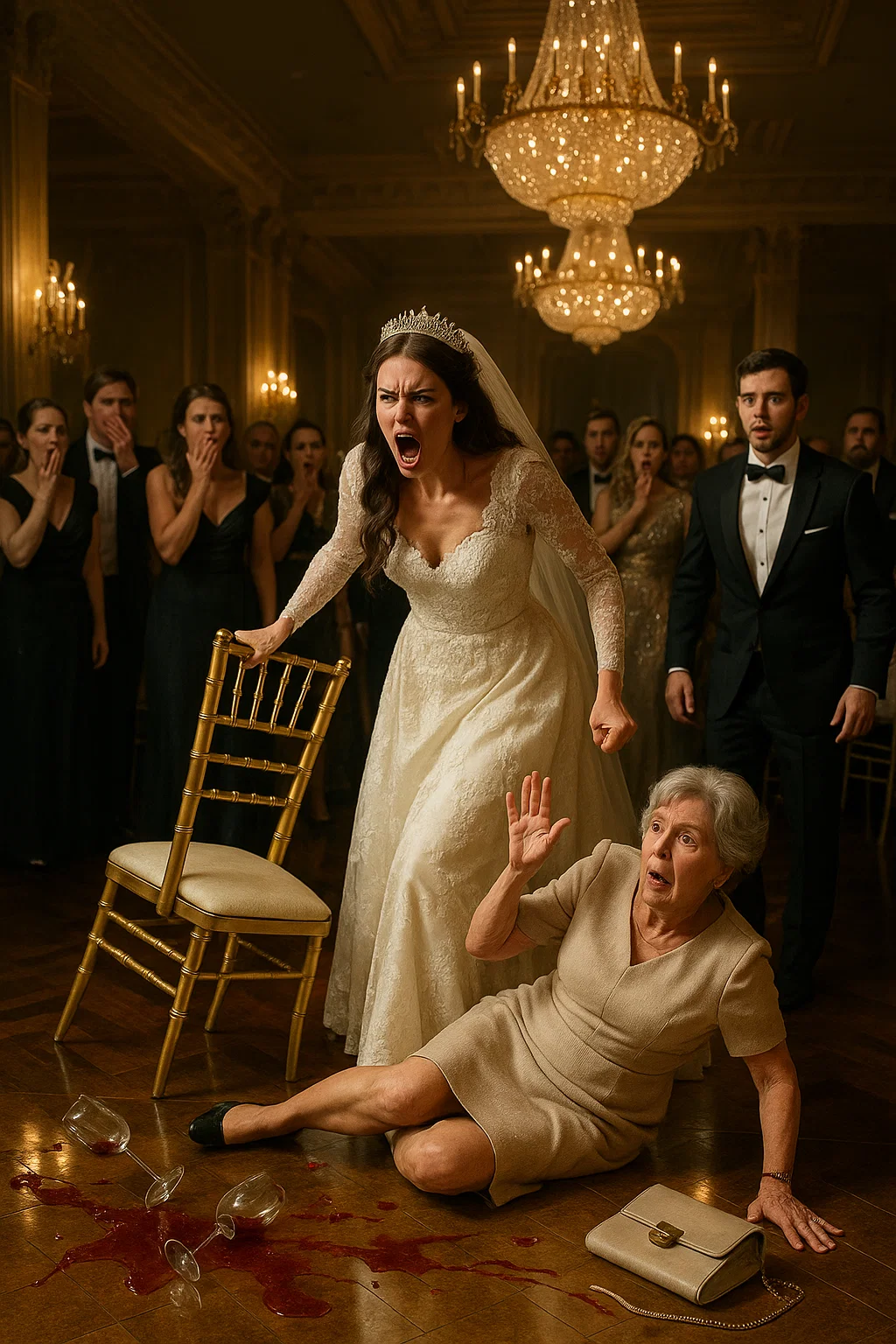 The entire hall was frozen. Guests exchanged uncomfortable glances. Daniel knelt beside his mother, helping her pick up the fallen items. His face was pale with anger and disbelief.